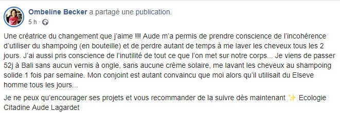 Spécialisée dans les soins de beauté naturels, Aude Lagardet est également kinésiologue dans le sud-est de la France et la créatrice du blog Ecologie Citadine. Elle prône l’Ecologie de Soi : protéger la planète, en pensant d’abord à soi et en s’amusant. Son approche se veut ludique, simple et efficace. Aude a déjà accompagné des centaines de personnes vers le No Poo, qu’elle pratique elle-même depuis de nombreuses années.